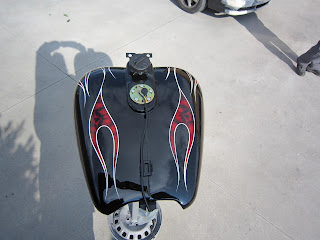 Harley davidson electra glide tank black, red flames with skulls and white threads.